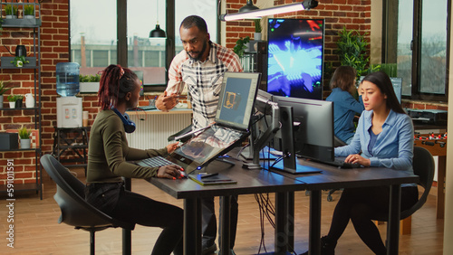 Creative content creators working with artistic development industry, using multiple monitors on desk. Team of production department employees developing artificial intelligence technology.
