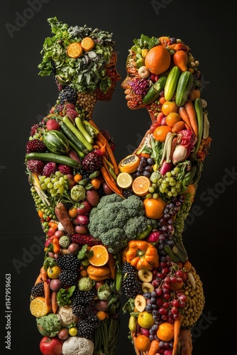 Creative depiction of human figures formed with assorted fruits and vegetables