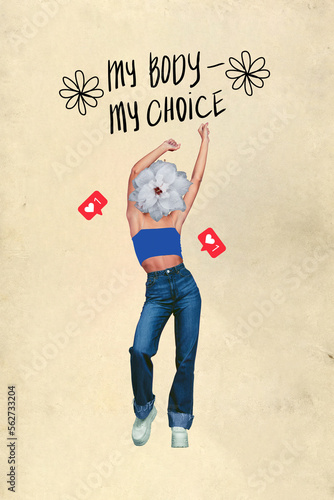 Creative digital blog post collage of bizarre not perfect woman with flower face enjoying love your body choice concept
