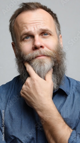 Creative director with neutral expression contemplating ideas in a studio setting during daylight hours