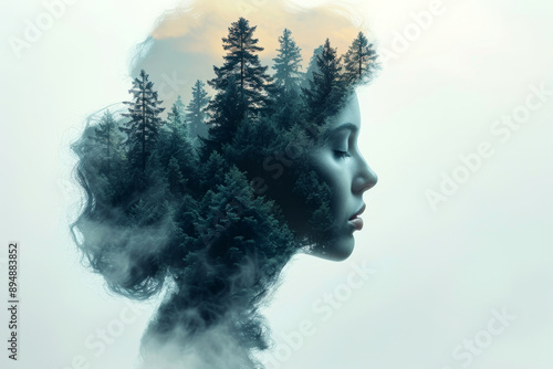 Creative double exposure image blending woman profile with misty forest, evoking sense of nature and introspection, symbolizing connection between human spirit and natural world