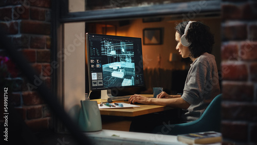 Creative Female 3D Architect Artist Using Desktop Computer with Display Showing CAD Real Estate Project. Brazilian Woman Video Game Developer Creating Gaming Level. View Into the Apartment Window.