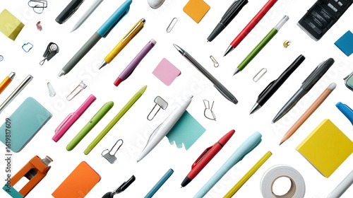 Creative Flat Lay of Work Tools: A creative flat lay of work tools such as pens, paper, and office supplies, isolated on a Transparent background, PNG file.