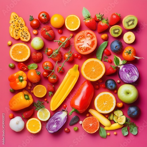 Creative food arrangement, intricate flat lay of fruits and vegetables, flat design illustration