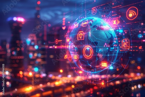 Creative glowing polygonal globe hologram with various digital icons overlaid on a blurred cityscape