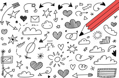 Creative hand drawn doodles with a red pencil illustrating ideas and imagination