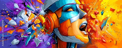 creative idea generation creative mindset vision A vibrant digital artwork showcasing a robotic face exploding with colorful shards, embodying creativity and innovation.