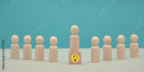 Creative idea, innovation. Think different. Person creation. Wooden figure stands on cube. Lightbulb sign, copy space