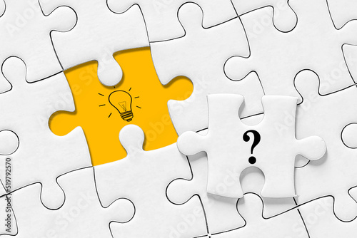 Creative idea or problem solving concept, question mark and light bulb icon on jigsaw puzzle, jigsaw puzzle with missing piece