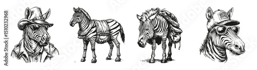 Creative Illustrations of Zebras in Unique Outfits and Accessories, vector illustration, engraving design, logo design set, black and white line