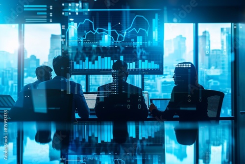 Creative image with hologram of a businessman in a corporate employee meeting via video call.