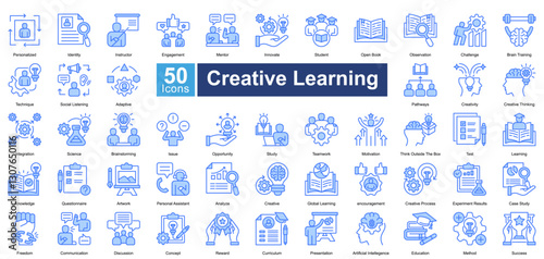 Creative Learning icon set in blue color style, featuring 50 icons of innovation, education, brainstorming, and problem solving. Perfect for e learning, teaching, and personal development.