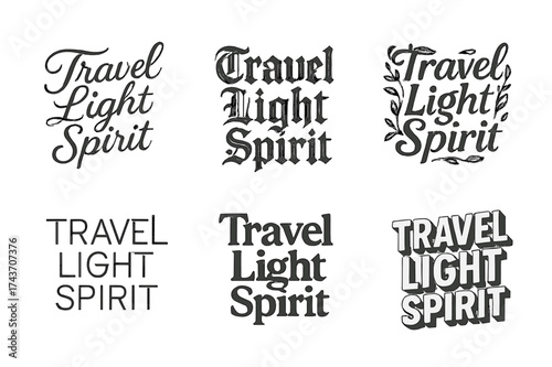 Creative Lettering Grid. Travel Light Spirit. Set lettering. harmonious lettering variations of the same emblematic concept, each with different artistic