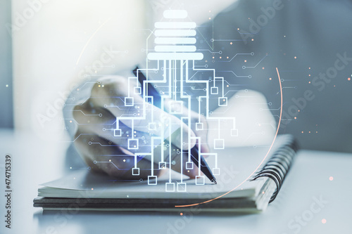 Creative light bulb illustration with microcircuit and man hand writing in diary on background, future technology concept. Multiexposure
