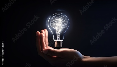 Creative, new ideas and innovation, Hand holding light bulb and smart brain inside and innovation icon network connection on dark blue city background, innovative technology in science and industrial