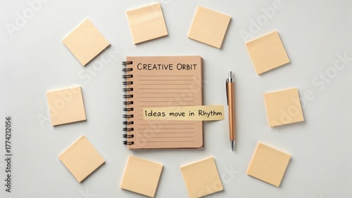 Creative Orbit Notebook Surrounded by Sticky Notes and a Pen, Capturing the Spirit of Idea Generation and Creative Thinking