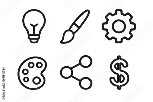 Creative process icon set for business. Light bulb idea, art brush, gear settings, color palette, share network & dollar money sign. Line art vector illustration for web.