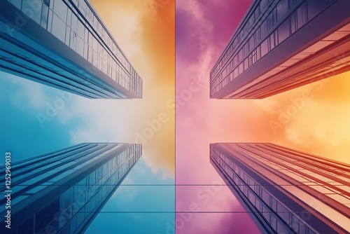 Creative split view of skyscrapers with contrasting colors in a modern urban environment. Innovative visual concept