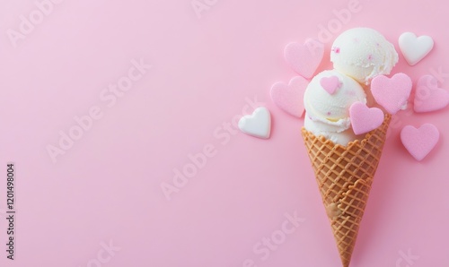 Creative sweet concept. Ice cream cone with pink and white hearts on a pink background. Valentine's Day