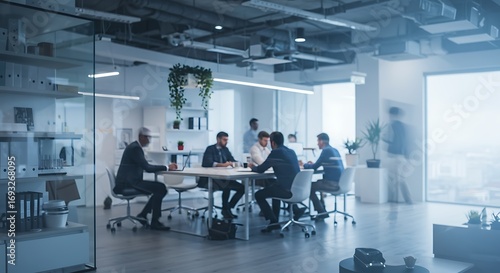 Creative take on Abstract blurred interior modern office space with business people working banner background