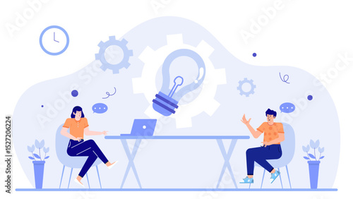 Creative teamwork concept with two people brainstorming under a lightbulb, suitable for business, collaboration, idea generation, creativity, and innovation.
