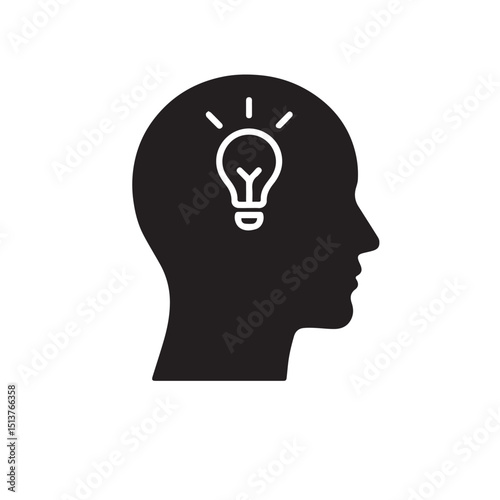 Creative Thinking Concept – Light Bulb in Human Head Silhouette, Black and White Minimalist Design