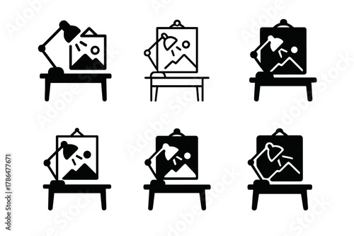 Creative Workspace Logos. Creative workspace with art on walls. Set Logo of Creative workspace with art on walls: desk lamp illuminating a canvas on the wall.