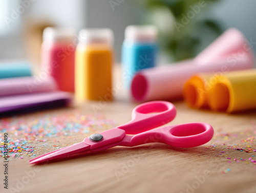 Creative workspace scene pink scissors, colorful confetti, paper and paint, suggesting crafting, creativity, DIY projects, and artistic endeavors. Bright, cheerful, and inspiring.