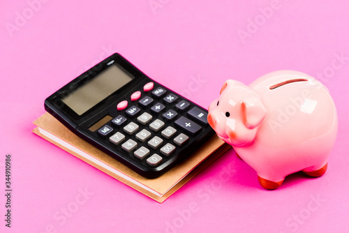 Credit concept. Calculate profit. Piggy bank pink pig and calculator. Finance manager job position. Economics and finance. Trading exchange. Trade market. Finance control. Business administration