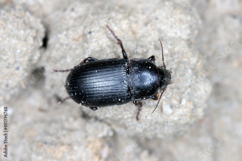 Creeping bread grains ground beetle - Zabrus tenebrioides on soil with cereal plantation.
