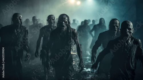 Creepy dead come on Halloween night, zombies walk in city or forest during apocalypse. Scary undead running in spooky mist like in horror movie.