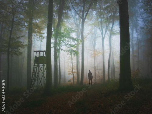 Creepy mysterious foggy forest during autumn day with a man observing nature and colorful foliage