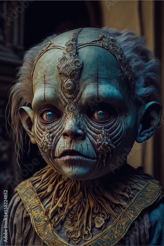 Creepy scary orphaned ghost child in eerie wooden mask, sad dead ghosts. Character design horror.