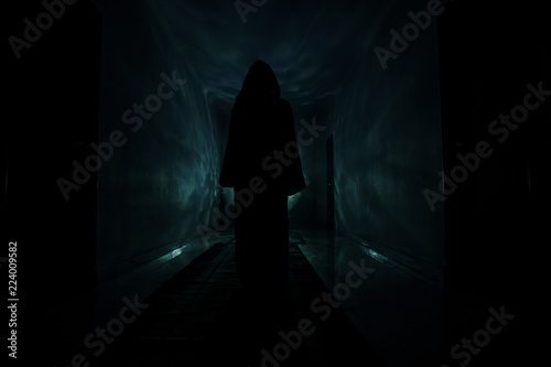 Creepy silhouette in the dark abandoned building. Dark corridor with cabinet doors and lights with silhouette of spooky horror person standing with different poses.