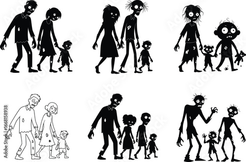 Creepy zombie family silhouettes set, spooky undead parents and children walking together, horror illustration for Halloween decoration and scary designs