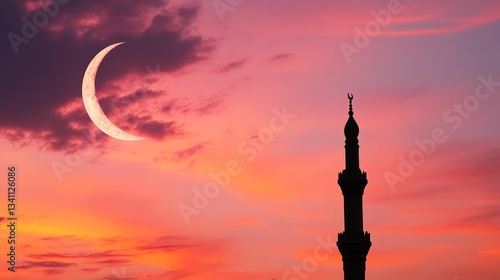 Crescent Moon and Minaret at Sunset: A Serene Islamic Landscape