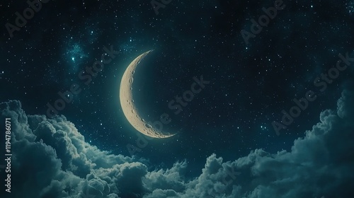 Crescent moon in night sky with clouds and stars.