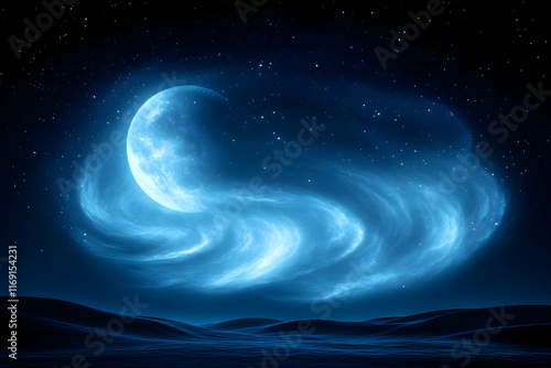 Crescent moon with swirling blue nebula over dark desert landscape at night.