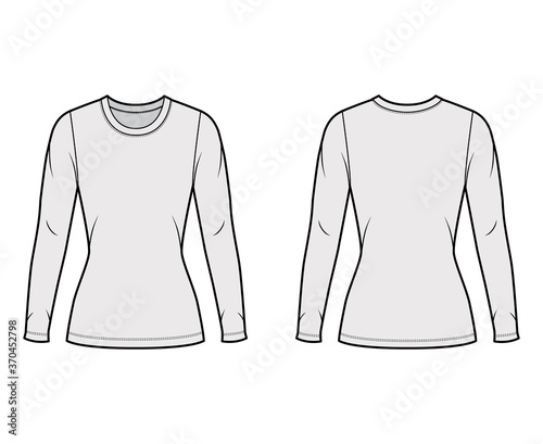Crew neck jersey sweater technical fashion illustration with long sleeves, close-fitting shape, tunic length. Flat outwear apparel template front back grey color. Women men unisex shirt top CAD mockup