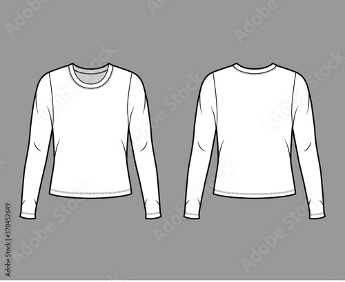 Crew neck jersey sweater technical fashion illustration with long sleeves, oversized body. Flat outwear apparel template front back white color. Women men unisex shirt top CAD mockup