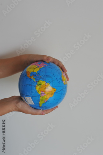 criança menina segurando globo terrestre escolar, cuidado e amor com o planeta terra