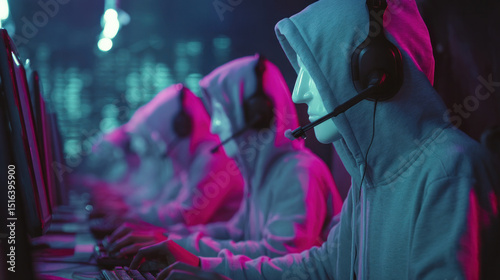 Criminal call center with multiple masked individuals in hoodies, wearing headsets and working at computers, dim neon lighting, cyber fraud and scam network theme
