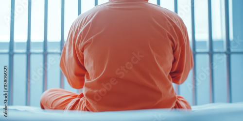 Criminal man in orange uniform sit on prison bed behind prison cell bars. Prisoner, inmate in detention center or correctional facility