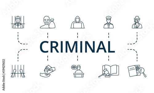 Criminal outline set. Creative icons: prisoner, thief, hacker, police officer, detective, jail, corruption, witness, law, evidence.