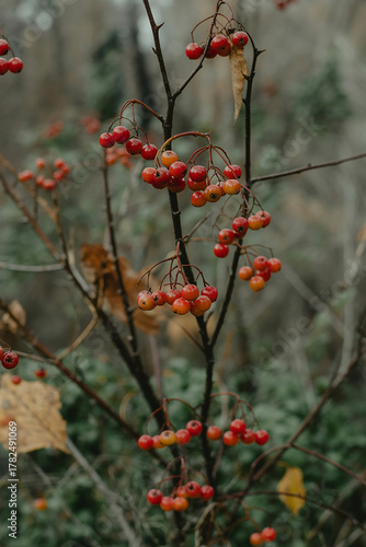 Crimson berries shining on a bare tree in autumn, a striking nature display for seasonal marketing, holiday promotions, and elegant botanical designs