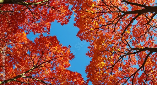 Crimson Canopy Autumn Blaze Autumnal Embrace Skyward Gaze Blazing Red Leaves Bright Blue Sky A fiery canopy overhead Crimson Canopy Of Autumn Under a fiery autumn sky Upward View Of Autumn Leaves