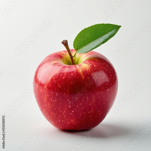 Crimson Delight A Crisp Red Apple with a Vibrant Green Leaf on a Clean White Background
