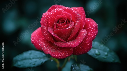 Crimson rose unfolds, adorned with sparkling dew, against deep green foliage