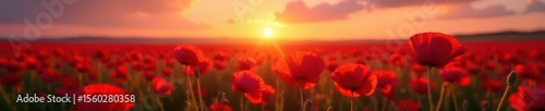 Crimson sunset bathes swaying poppy field, vibrant red petals , beauty, texture
