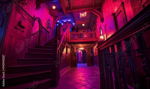 Crimson-lit mansion hallway, grand staircase, mysterious ambiance.